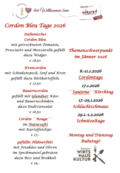 Ort: Rest. Karawankenblick am Pyramidenkogel in KeutschachCordon-Bleu Tage bis einschließlich den 11.1.2026