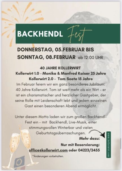 Vom 5. bis 8. Februar wird beim Kollerwirt groß gefeiert. 40 Jahre Kollerwirt werden mit einem Backhendlfest gefeiert. 15 Jahre Tom Soete und zuvor 25 Jahre Fam. Kaiser.