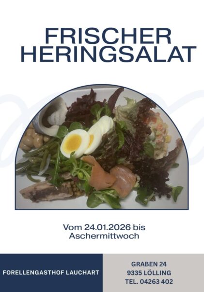 Ort: Forellengasthof Lauchart in Lölling… noch bis zum Aschermittwoch wird im Forellengasthof Lauchart in Lölling frischer Heringssalat serviert.