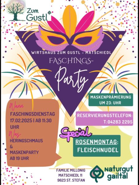 Ort: Gasthaus zum Gustl in MatschiedlFamilie Millonig vom Gasthaus zum Gustl in Matschiedl lädt am Faschingsdienstag zur großen Faschingsparty! Heringsschmaus und Maskenparty ab 19:00 Uhr …