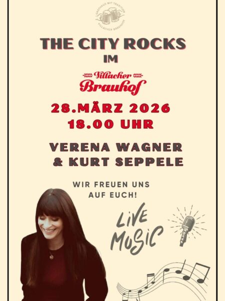 Ort: Villacher Brauhof in VillachSchon gesehen? THE CITY ROCKS beginnt am 28.03.2026 im Villacher Brauhof! Seid dabei, startet mit bester Live-Musik von Verena Wagner & Kurt Seppele in die Osterferien!