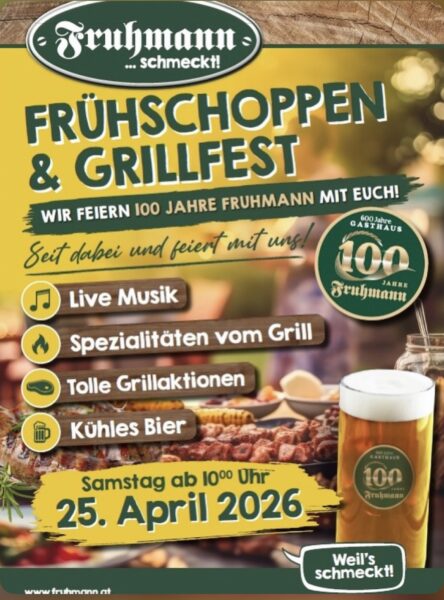 Ort: Gasthaus Fruhmann in WernbergAnläßlich des 100 Jahr Jubiläums, lädt Familie Fruhmann am Samstag 25. April ab 10:00 Uhr zum großen Frühschoppen und Grillfest. Livemusik, Grillspezialitäten, kühles Bier erwarten die Besucher.